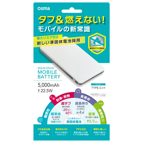 準固体モバイルバッテリー 5000mAh 22.5W ホワイト