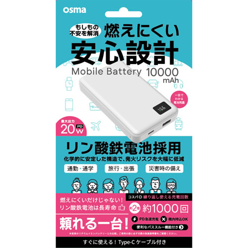 LFPUC100D-CCWHデジタル表記機能付リン酸鉄リチウムモバイルバッテリー 10000mAh 20W ホワイト -